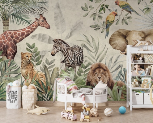 Tworzenie pokoju dziecka z motywem dżungli i zwierząt to świetny sposób, aby wprowadzić do wnętrza kolor, przygodę i wyobraźnię. Fototapeta z tropikalną roślinnością, lwem, słoniem, żyrafą i papugami może stać się centralnym punktem pokoju, który inspiruje do zabawy, nauki i codziennych odkryć.