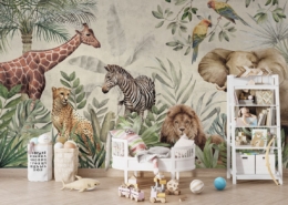 Tworzenie pokoju dziecka z motywem dżungli i zwierząt to świetny sposób, aby wprowadzić do wnętrza kolor, przygodę i wyobraźnię. Fototapeta z tropikalną roślinnością, lwem, słoniem, żyrafą i papugami może stać się centralnym punktem pokoju, który inspiruje do zabawy, nauki i codziennych odkryć.
