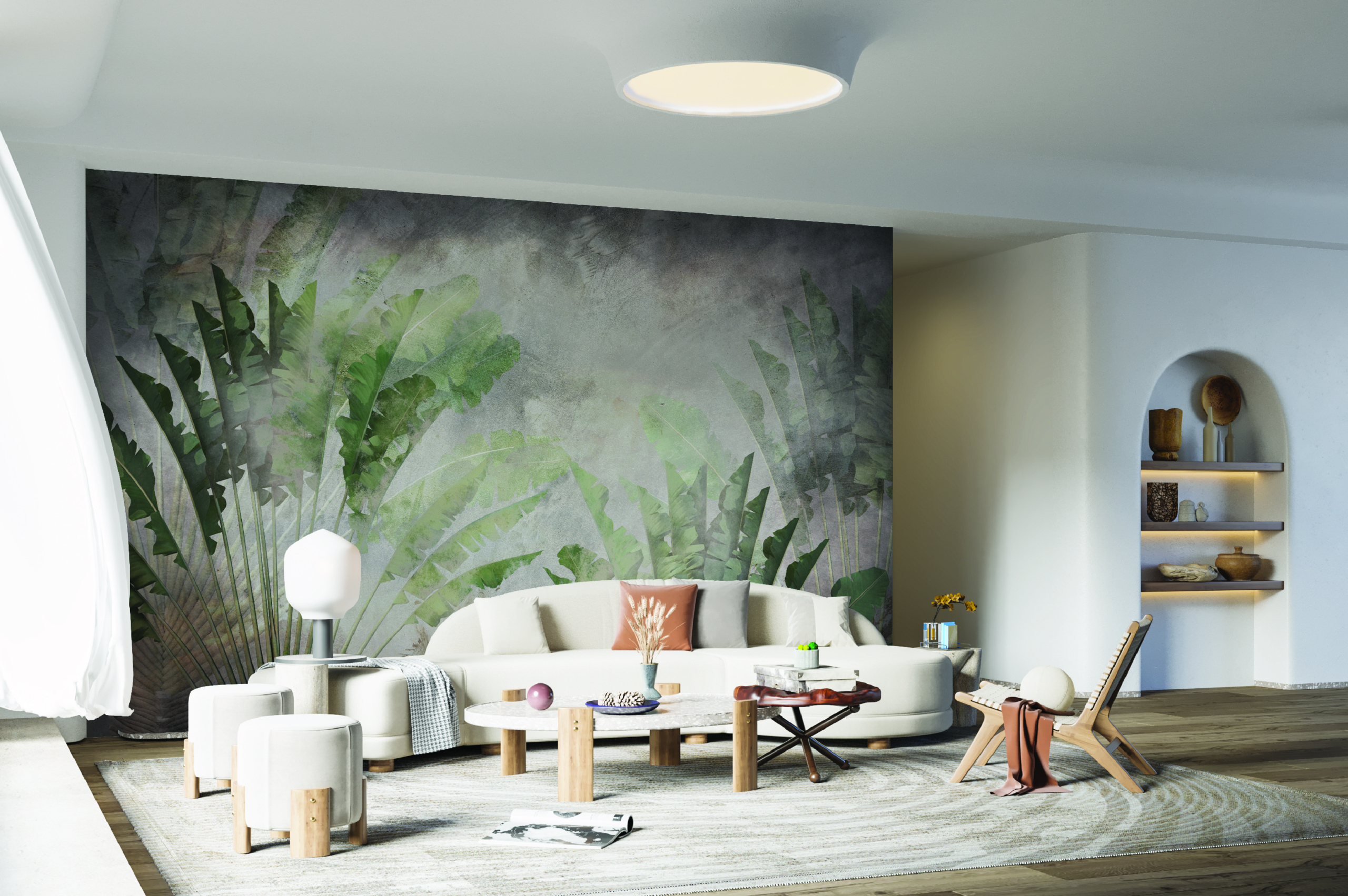 Nowoczesne fototapety często czerpią inspirację z natury, ale przedstawiają ją w bardziej stylizowanej, uproszczonej formie. Liście, trawy czy organiczne kształty są delikatnie rozmyte, jakby zanurzone w lekkiej mgle. Dzięki temu wzór nie dominuje wnętrza, lecz harmonijnie się z nim łączy. To rozwiązanie szczególnie docenią osoby, które chcą uniknąć przesytu dekoracyjnego, a jednocześnie nadać ścianie wyjątkowy wygląd.