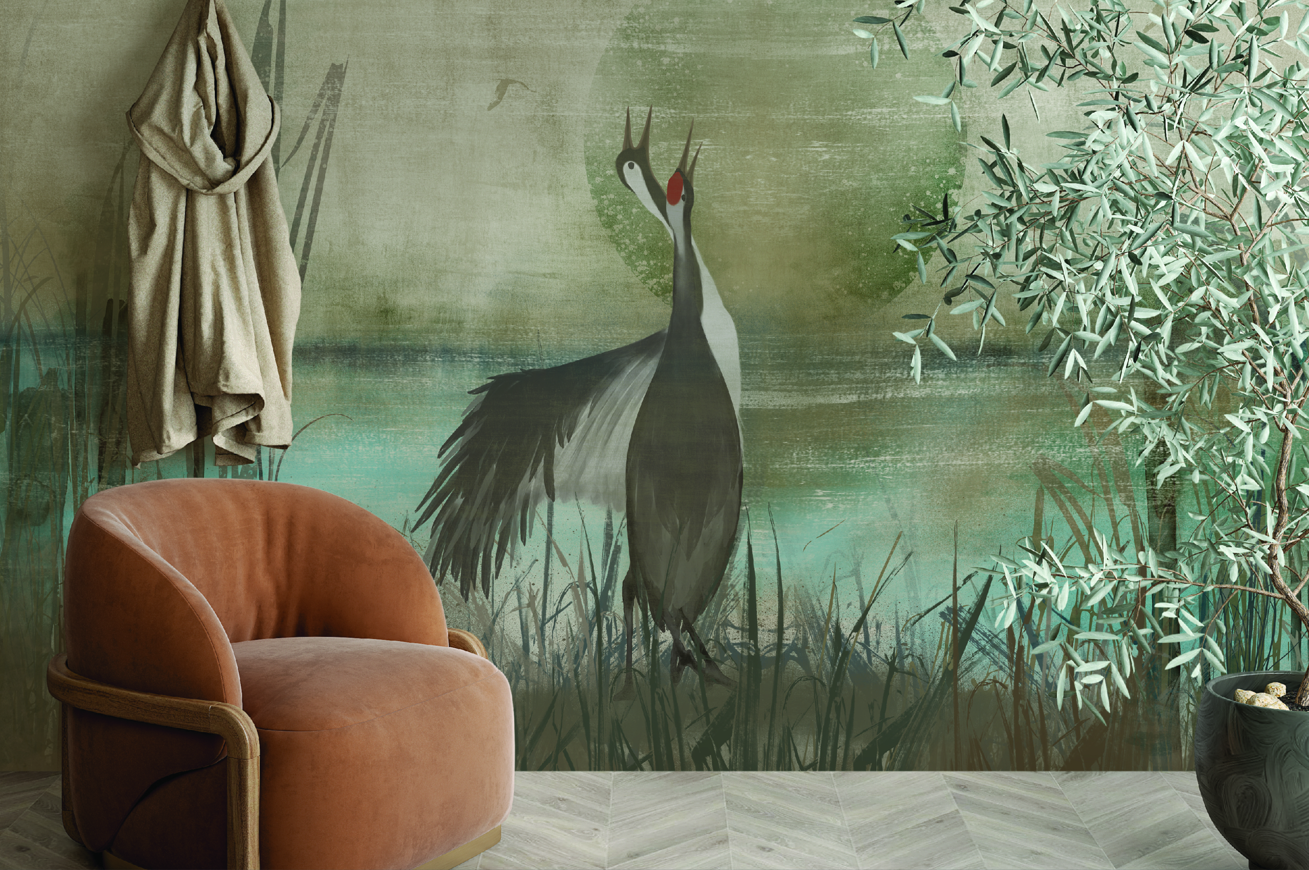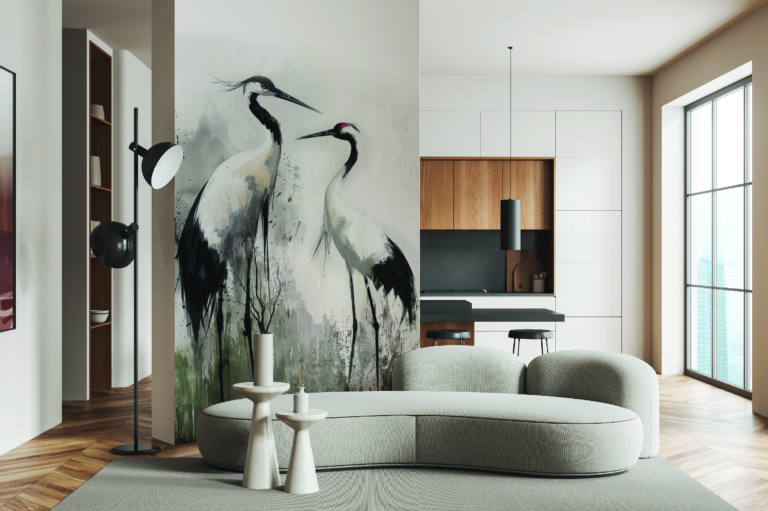 Kolorystyka tych fototapet jest zazwyczaj stonowana i naturalna. Dominują odcienie beżu, szarości, zieleni oraz delikatne akcenty czerni i bieli. Dzięki temu wzory nie są przytłaczające, a jednocześnie zachowują swoją wyrazistość. W niektórych projektach pojawiają się subtelne kontrasty – na przykład czerwone detale na głowie żurawia – które dodają całości charakteru i przyciągają wzrok.