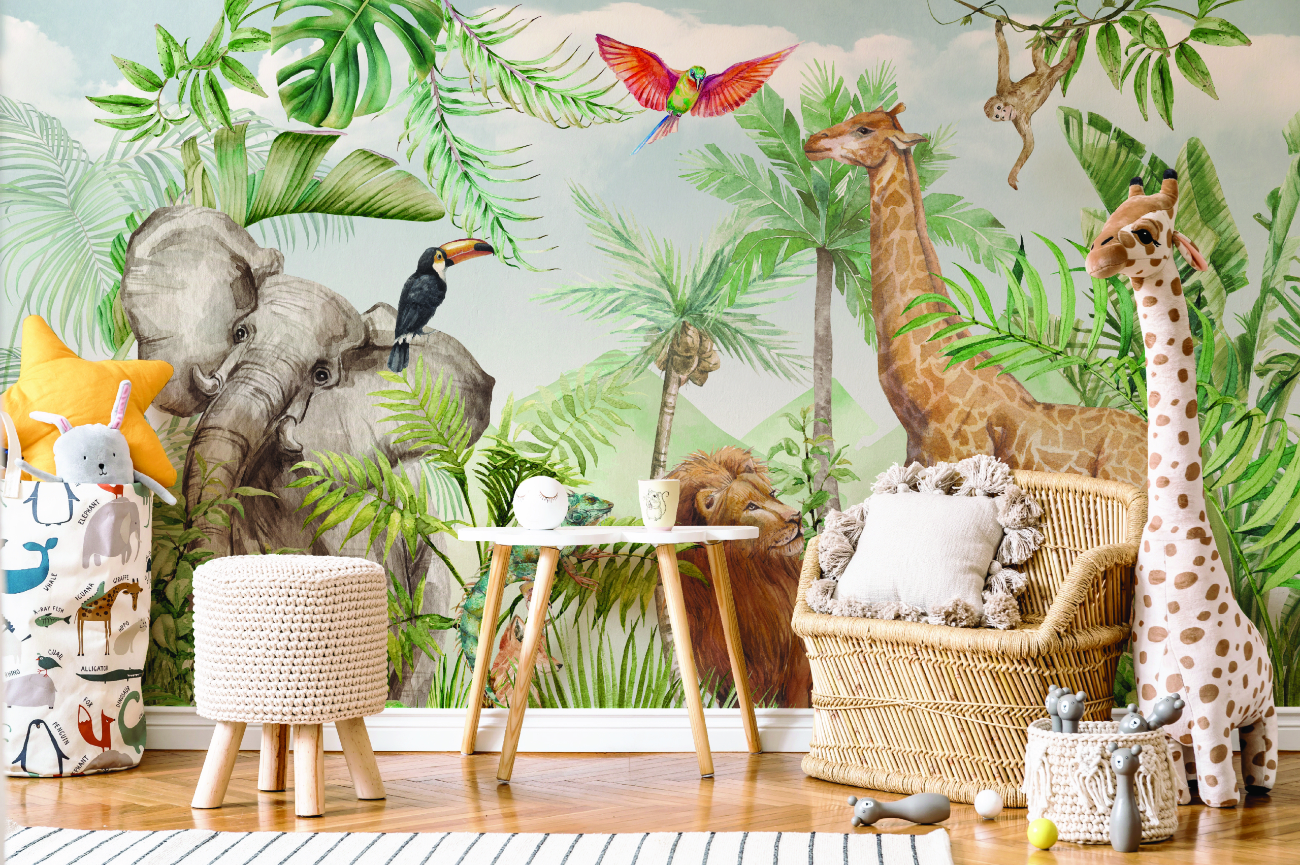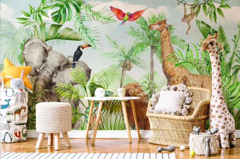 Jednocześnie w tej kategorii nie brakuje bardziej dynamicznych i kolorowych propozycji. Egzotyczne zwierzęta z dalekich krajów – takie jak żyrafy, lwy, słonie czy kolorowe ptaki – wprowadzają do wnętrza energię i radość. Takie fototapety doskonale sprawdzą się w pokojach dzieci, które uwielbiają przygody i marzą o odkrywaniu świata. Intensywniejsze kolory pobudzają kreatywność i sprawiają, że przestrzeń staje się bardziej wyrazista i inspirująca.