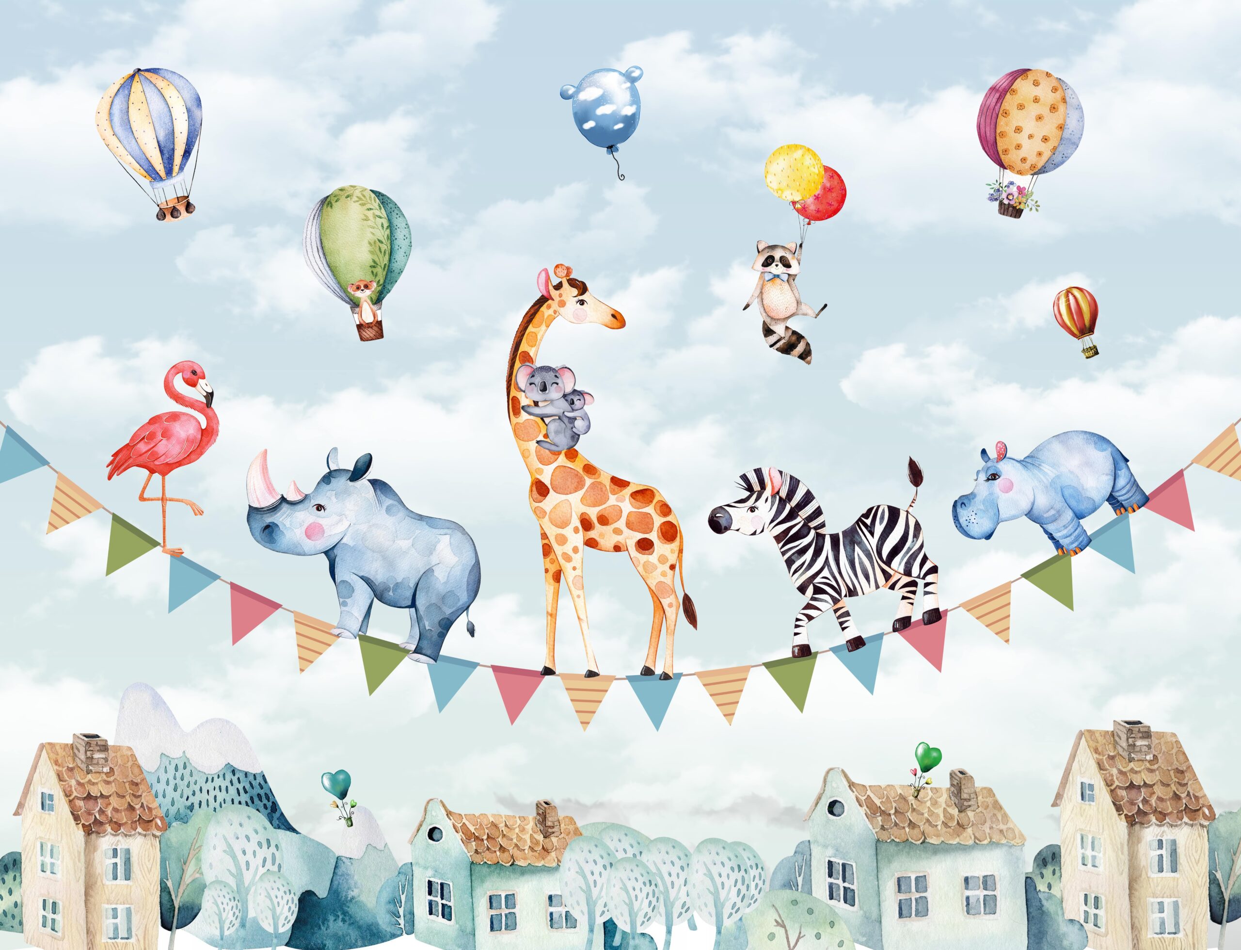 Wprowadź do pokoju dziecka wyjątkową atmosferę dzięki fototapecie „Balansujące Safari”. Ta urocza, kolorowa ilustracja przedstawia sympatyczne zwierzęta – żyrafę, zebrę, nosorożca i inne – bawiące się na linie z wesołymi chorągiewkami oraz balonami unoszącymi się na tle jasnego, niebieskiego nieba. Pełna ciepła i fantazji scena rozbudzi dziecięcą wyobraźnię i wniesie do wnętrza radość oraz spokój.