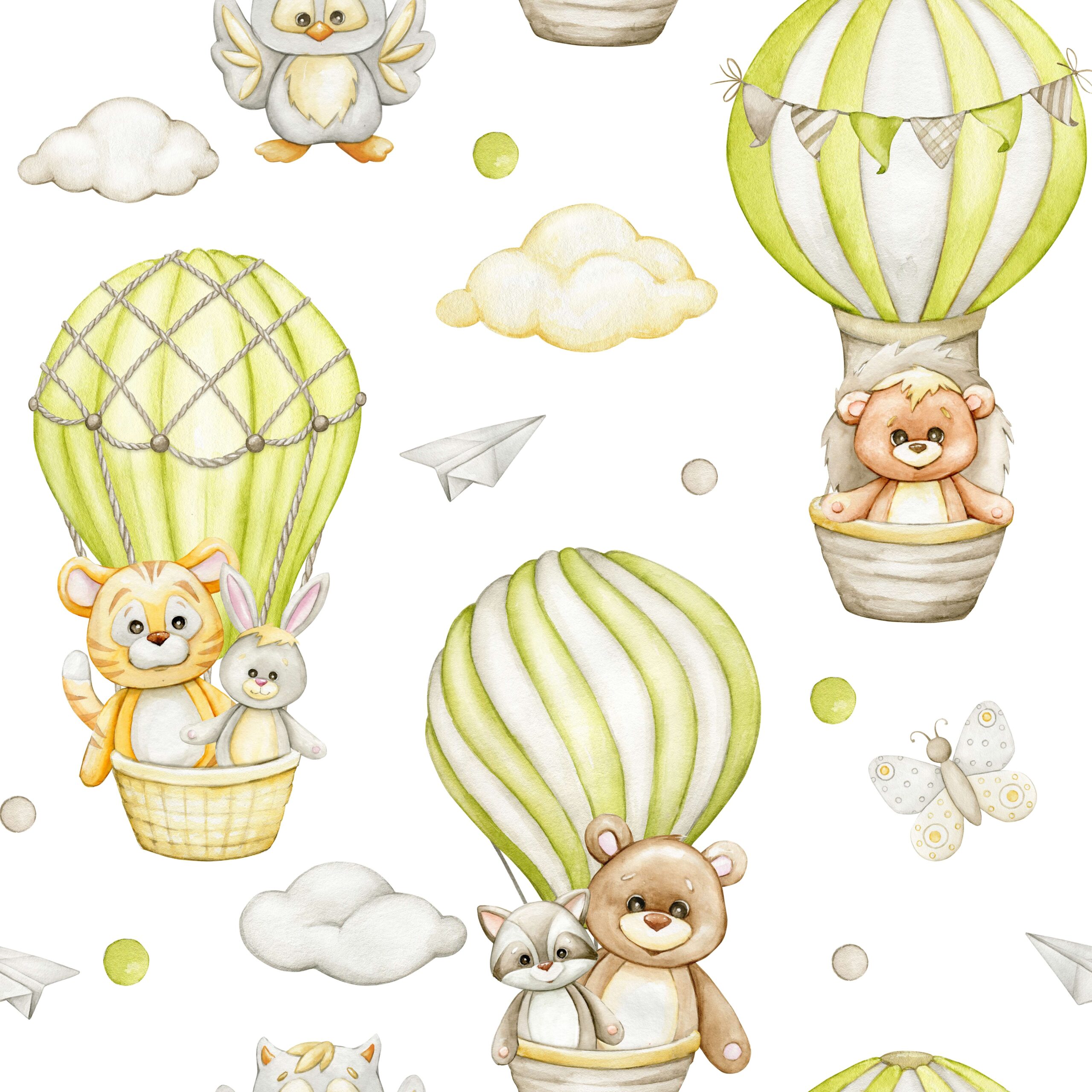 Zanurz się w magiczny świat dziecięcej fantazji dzięki fototapecie „Balonowe Przygody Małych Przyjaciół”. Ten uroczy wzór przedstawiający sympatyczne zwierzątka podróżujące balonami pośród chmur, papierowych samolocików i motyli tworzy atmosferę beztroskiej przygody i radości. Stonowana kolorystyka z pastelowymi akcentami sprawia, że tapeta idealnie wpasuje się w każdą dziecięcą przestrzeń.