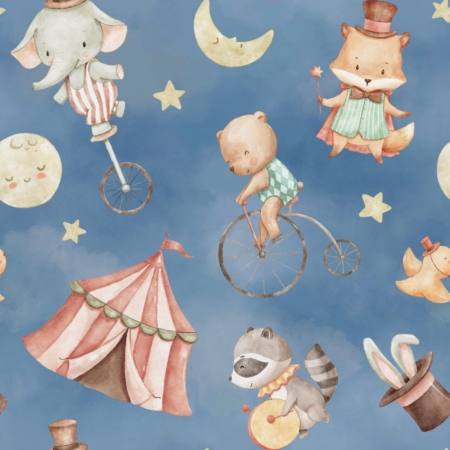 Zanurz się w magiczny świat snów z fototapetą „Cyrkowa Noc nad Chmurami”. Ten pełen uroku, kolorowy motyw przedstawia wesołą paradę zwierząt cyrkowych balansujących na linie ponad chmurami – wśród gwiazd, balonów i świetlistego księżyca. Skaczące króliki, żyrafa jedząca lody czy hipopotam grający na skrzypcach – każdy szczegół to zaproszenie do zabawy i rozwijania dziecięcej wyobraźni.