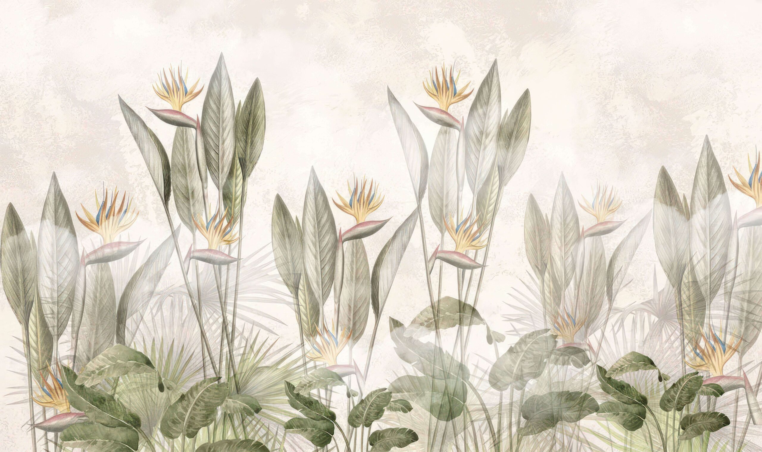 Wprowadź do swojego domu wyjątkowy nastrój dzięki fototapecie „Delikatna Tropikalna Mgła”. Ten eteryczny wzór roślin tropikalnych o stonowanej, pastelowej kolorystyce tworzy aurę delikatności i spokoju, przywołując na myśl mglisty, tropikalny poranek. Lekko rozmyte kontury i naturalne odcienie zieleni i żółci doskonale komponują się zarówno z nowoczesnymi, jak i klasycznymi aranżacjami.