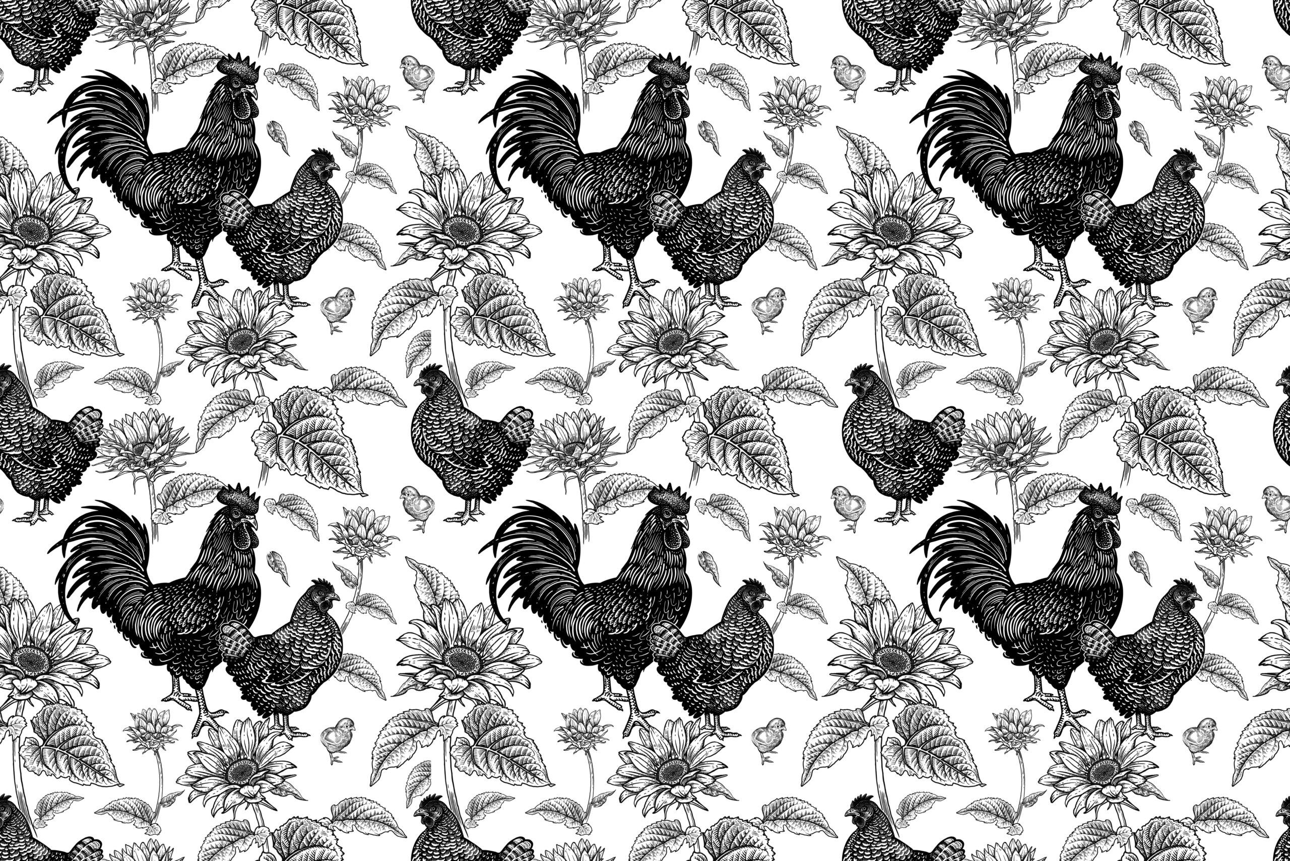 Ożyw swoje wnętrze dzięki fototapecie „Kurza Łąka” – wzorowi, który łączy w sobie urok tradycyjnej wsi z artystyczną precyzją klasycznych ilustracji botanicznych. Misternie rysowane kury, koguty i pisklęta w otoczeniu słoneczników oraz liści tworzą spokojny, czarno-biały pejzaż pełen ciepła, harmonii i nostalgii.