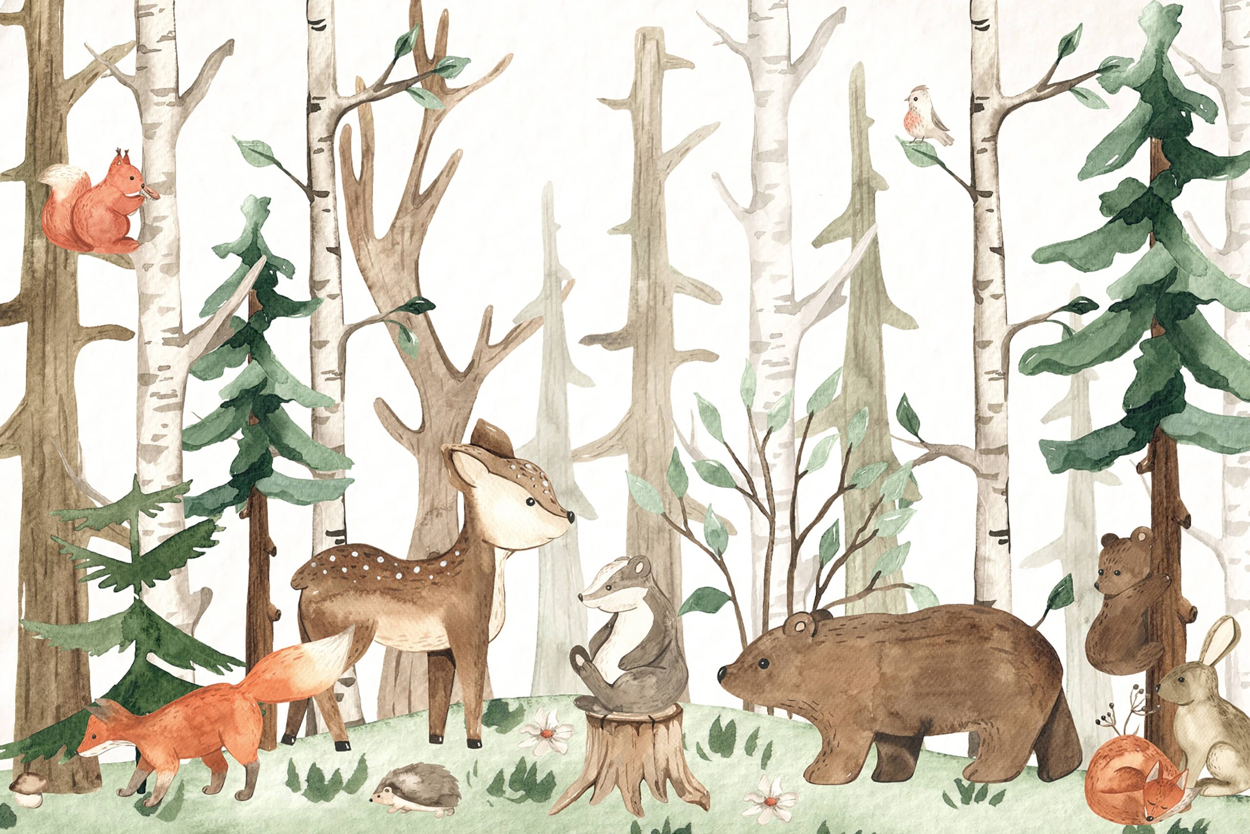 Przenieś dziecko do magicznego świata lasu dzięki fototapecie „Leśna Gromadka”. Ten wyjątkowy, akwarelowy wzór przedstawia spokojny las pełen sympatycznych zwierząt – od wiewiórek, przez lisa, jelonka, jeża, aż po niedźwiedzie i zajączka. Delikatne kolory, miękkie linie i przyjazne postacie tworzą ciepłą i przytulną atmosferę, sprzyjającą wyciszeniu i rozwojowi wyobraźni.