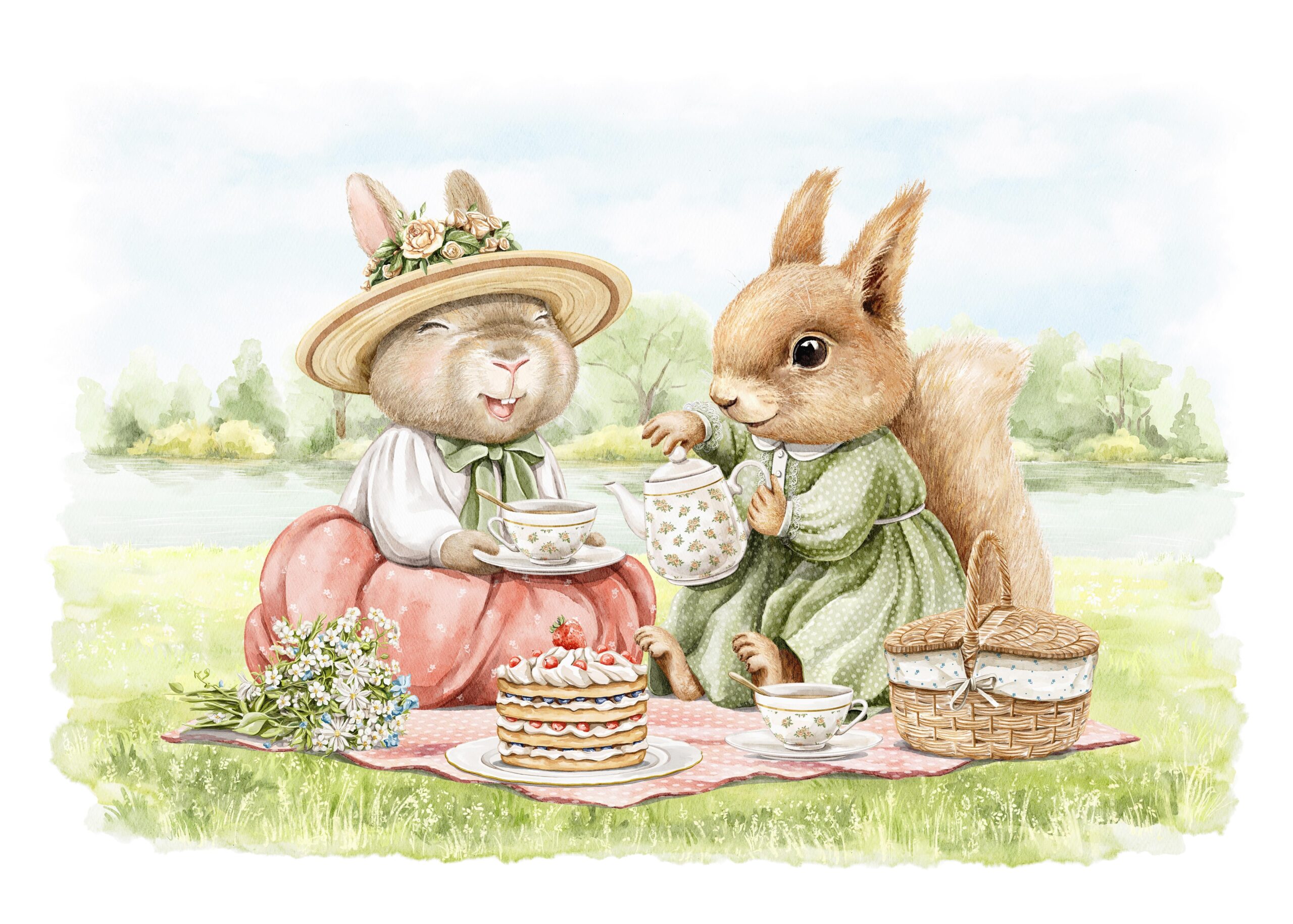 Wprowadź do pokoju swojego dziecka wyjątkowy nastrój dzięki fototapecie „Leśne Popołudnie przy Herbacie”. Ta misternie wykonana ilustracja przedstawia zająca i wiewiórkę podczas herbacianego pikniku w zielonym lesie, tworząc ciepłą, pełną radości i spokoju scenę. Delikatne pastelowe barwy i urocze detale przenoszą najmłodszych w świat bajkowej przygody, inspirując do kreatywnej zabawy i wyobraźni.