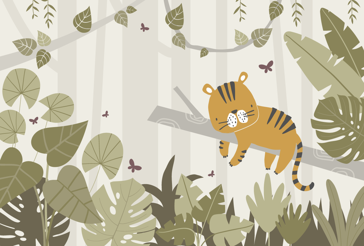 Wprowadź do pokoju swojego dziecka magiczny świat dzięki fototapecie „Mały Tygrysek w Zielonym Lesie”. Ten uroczy, kolorowy obrazek przedstawia małego tygryska odpoczywającego na gałęzi w otoczeniu zielonych liści i motylków, tworząc przyjazną i spokojną atmosferę pełną przygody i zabawy. Delikatne barwy i sympatyczny wzór sprawiają, że fototapeta doskonale pasuje do dziecięcych pokoi, przedszkoli czy kącików zabaw.
