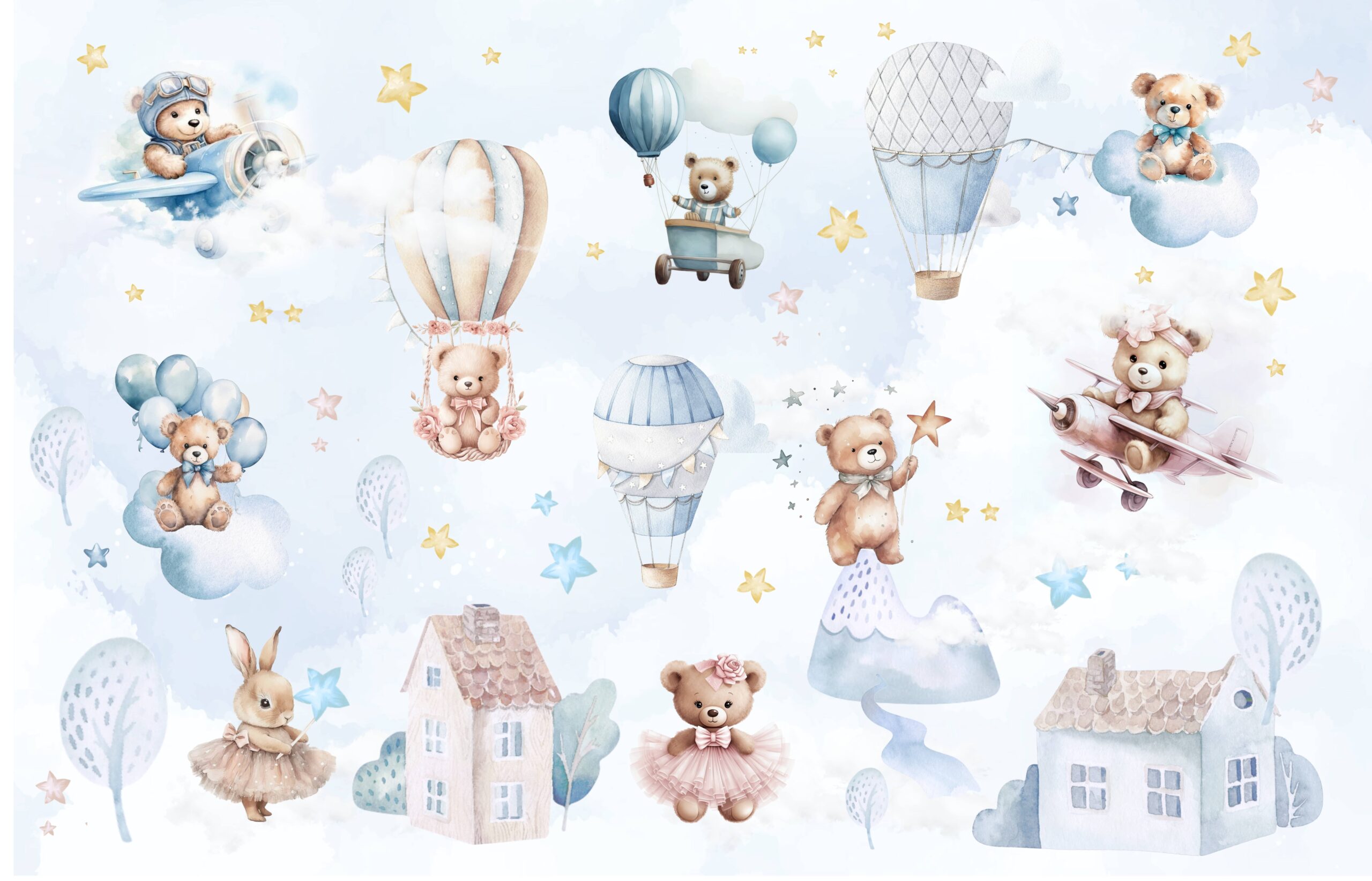 Wprowadź do pokoju swojego dziecka niezwykłą atmosferę dzięki fototapecie „Miśkowa Kraina Gwiazd”. Ten delikatny, pastelowy wzór przedstawia urocze misie unoszące się na balonach, chmurach i samolotach w otoczeniu gwiazdek, tworząc pełen ciepła i fantazji świat. Subtelne kolory i miękkie detale idealnie wpasują się zarówno do pokoju niemowlaka, jak i starszego dziecka, rozwijając jego wyobraźnię i zapewniając przytulną przestrzeń do zabawy i odpoczynku.