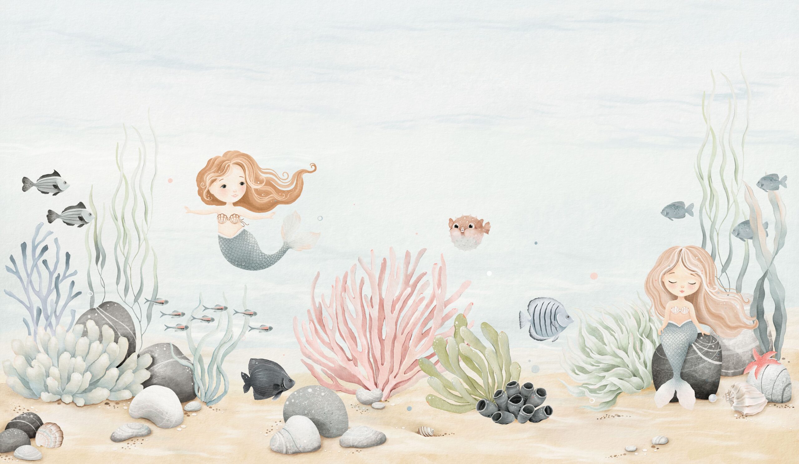 Zanurz się w niezwykły świat dzięki fototapecie „Podwodne Marzenia Syrenek”. Ten uroczy, pastelowy motyw z syrenkami, rybkami i morskimi roślinami przeniesie Twoje dziecko do zaczarowanego podwodnego świata pełnego przygód i wyobraźni. Delikatne kolory i miękkie kształty idealnie wpasują się w dziecięce pokoje, tworząc atmosferę spokoju i radości.