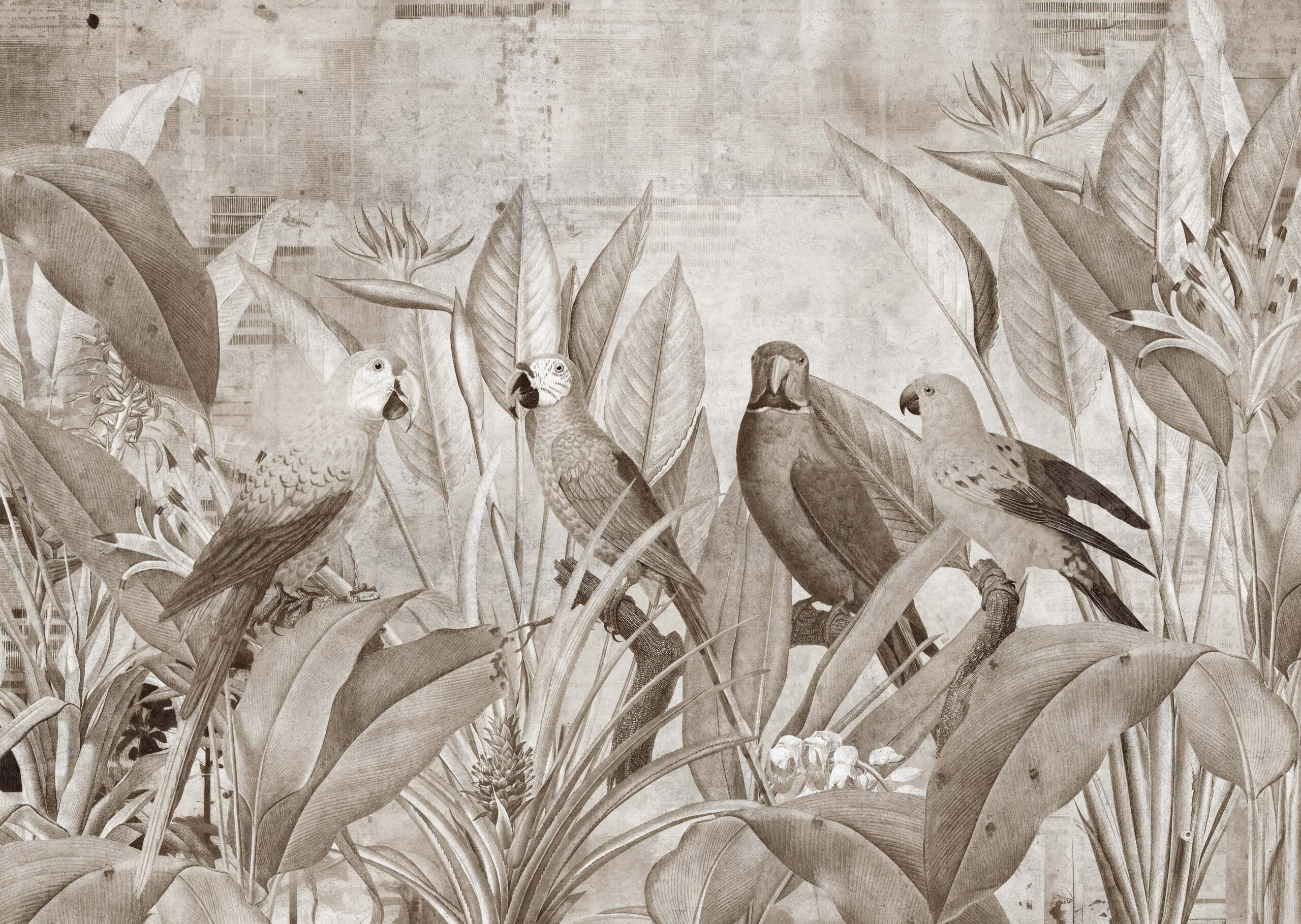 Wprowadź do swojego domu wyjątkowy klimat dzięki fototapecie „Rajskie Spotkanie”. Ten kunsztowny, sepia-tonowany motyw papug otoczonych bujną, tropikalną roślinnością przywołuje atmosferę egzotycznej dżungli, dodając przestrzeni ciepła i naturalnej elegancji. Precyzyjne detale ptaków oraz liści idealnie wpisują się zarówno w klasyczne, jak i nowoczesne aranżacje wnętrz.