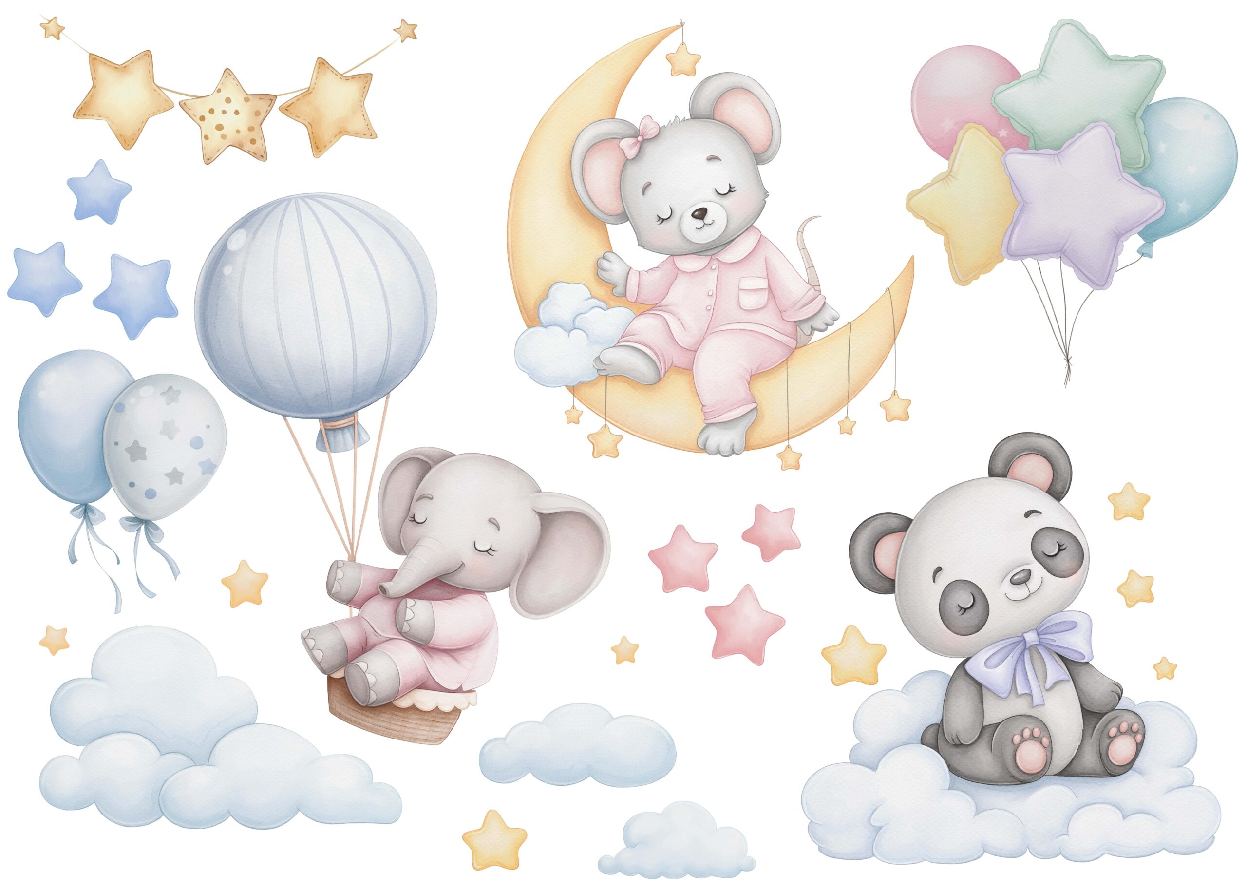 Wprowadź do pokoju dziecka atmosferę spokoju i czułości dzięki fototapecie „Senne Zwierzątka”. Ta wyjątkowa ilustracja przedstawia urocze, śpiące zwierzątka – myszkę na księżycu, słonika w balonie i misia na chmurce – otoczone pastelowymi gwiazdkami, balonikami i miękkimi obłokami. Subtelna kolorystyka i przyjazne postacie tworzą harmonijną, kojącą przestrzeń idealną do odpoczynku i marzeń.