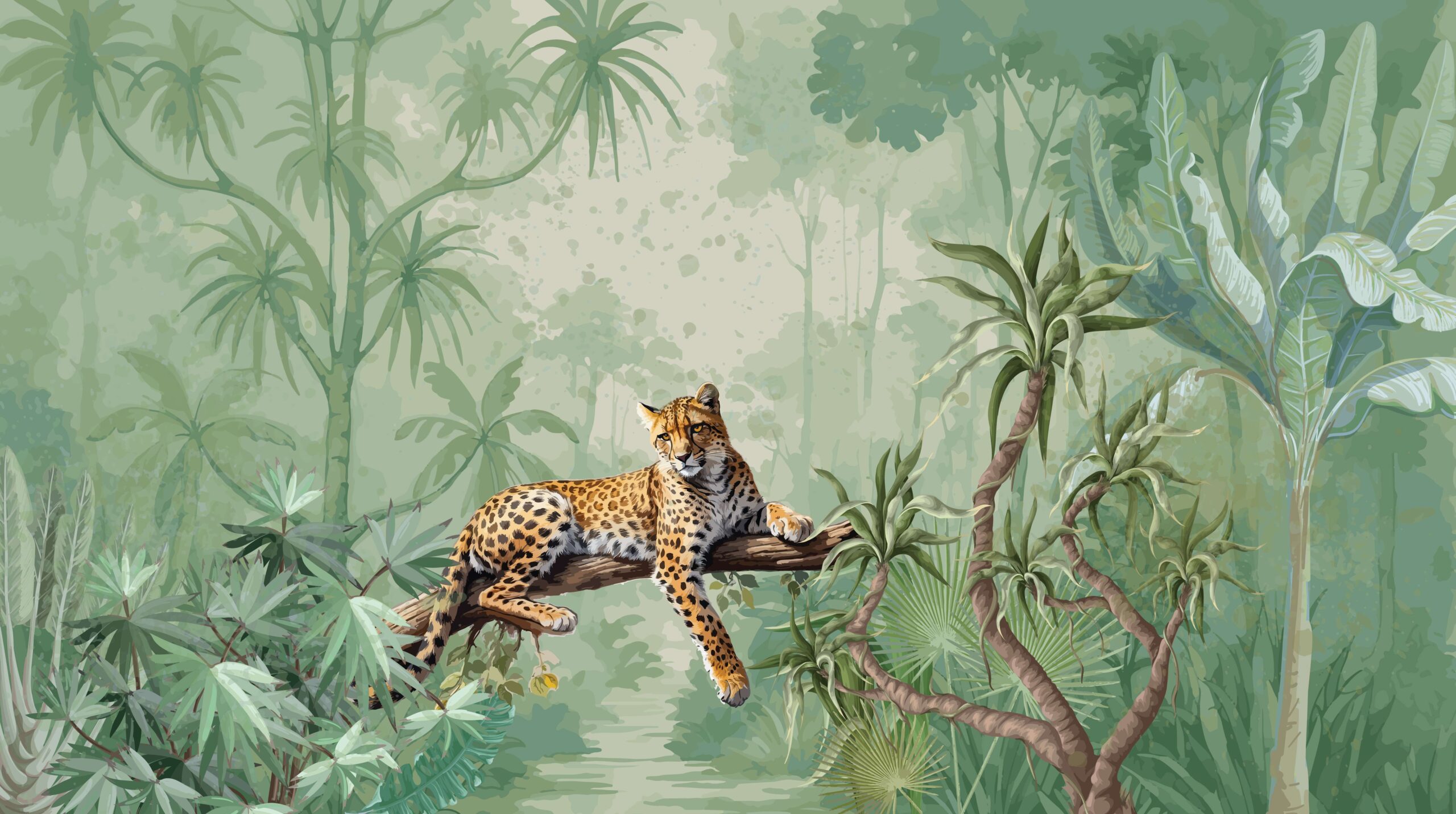 Odkryj niezwykły urok natury dzięki fototapecie „Spokój Dżungli”, która przenosi do świata egzotycznych roślin i dzikiej przyrody. Centralnym punktem kompozycji jest dostojny lampart odpoczywający na gałęzi, otoczony bujną, tropikalną zielenią. Ten malarski, starannie dopracowany motyw tworzy atmosferę spokoju, równowagi i lekko dzikiej elegancji.