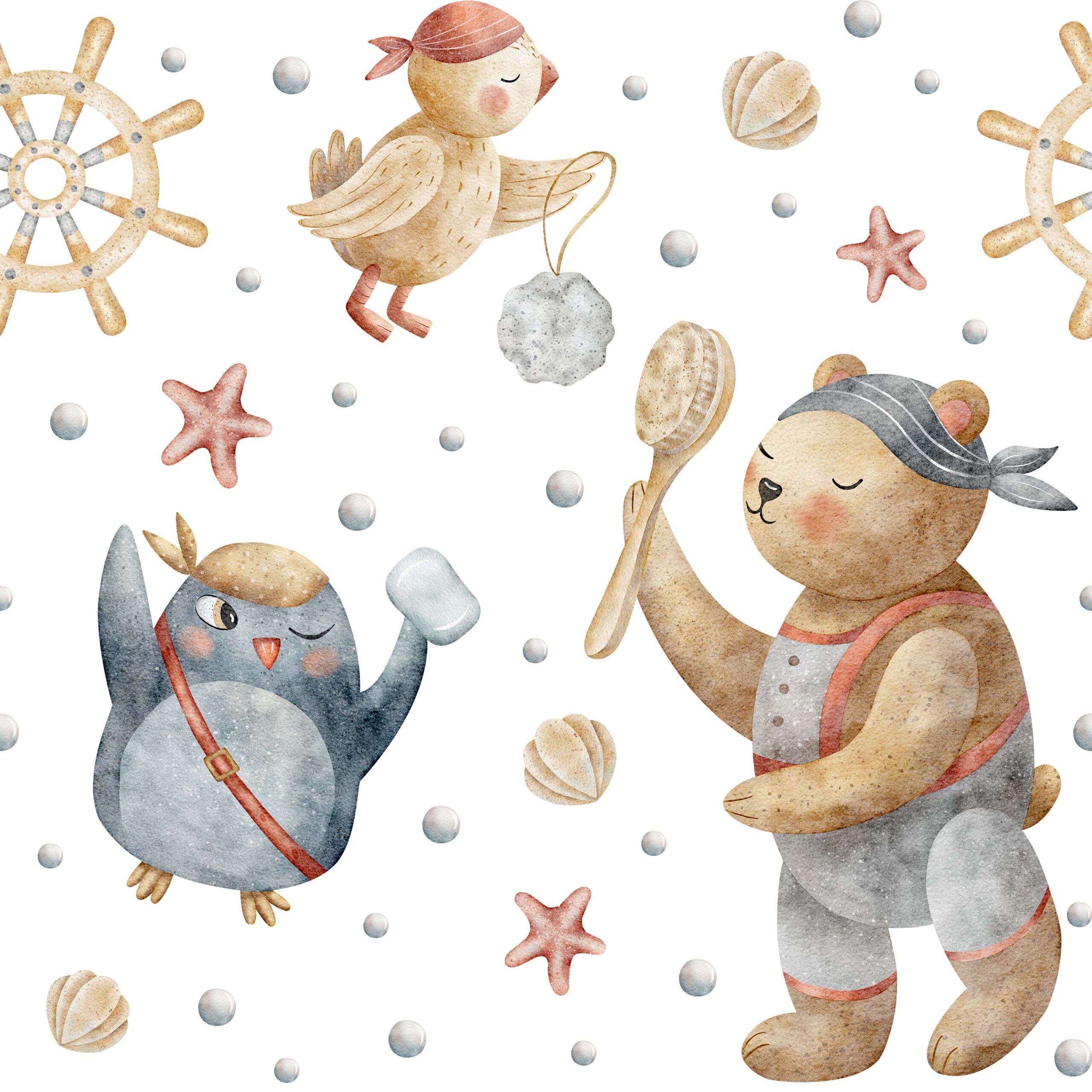 Wprowadź do pokoju malucha odrobinę fantazji i morskiej przygody dzięki fototapecie „Załoga Morskich Psotników”. Ten urokliwy, ręcznie malowany wzór przedstawia sympatyczne zwierzaki-piratów – misia, pingwinka i ptaszka – którzy razem odkrywają podwodny świat pełen muszelek, rozgwiazd i sterów. Ciepłe barwy, miękkie akwarelowe detale i przyjazne postacie sprawiają, że wnętrze nabiera bajkowego charakteru i przytulności.